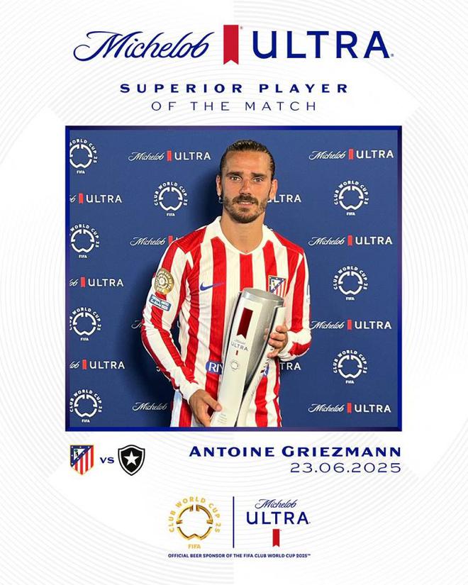 2025年世俱杯小组赛第三轮,马德里竞技1-0击败博塔弗戈,此役打入一球的马竞前锋格列兹曼当选世俱杯官方全场最佳球员。此役对阵博塔弗戈,下半场替补登场的格列兹曼在比赛第87分钟破门,帮助马德里竞技1-...